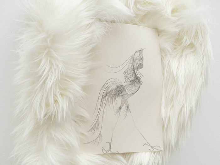 Petrit Halilaj, „They are Lucky to be Bourgeois Hens“, 2024; Pencil on paper, wood, faux fur