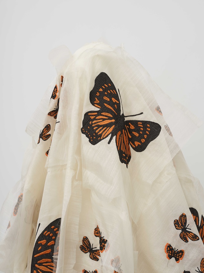Stephanie Comilang, „Manton de Manila – 1“, 2024; Embroidery on pineapple fabric, maniquin; Approximately: 180 × 60 × 90 cm; Dimensions variable