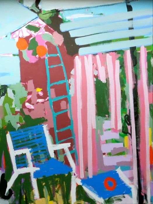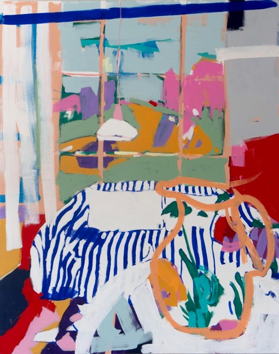 Auf der nächsten Ebene entdecken wir das Figürliche. Ein Stuhl hier, ein Tisch dort, eine Tasse irgendwo anders. Auf der dritten Ebene der Betrachtung beginnen die Bilder Geschichten zu erzählen. Geschichten von Orten, von Momenten, die sich dann im Kopf verselbstständigen und wie von selbst entwickeln. Anja Nürnberg lässt uns auf diese Weise unmittelbar an ihren Eindrücken, Erlebnissen und Beobachtungen teilhaben und lässt gleichzeitig durch künstlerische Abstraktion viel Raum für die eigene Fantasie. Die Bilder arbeiten mit den Betrachtern, aber sie werden auch geschaffen. Leben und Arbeiten sind für Anja Nürnberg wie selbstverständlich unter einem Dach vereint. Die Malerei ist untrennbar mit ihrem Leben verbunden; Familie und Freunde sind ebenso Teil ihres Schaffens wie die Landschaften, die sie bereist und die Orte, die sie besucht hat.