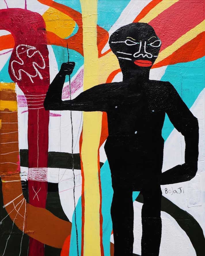 Adébayo Bolaji (* 1983 in London als Sohn nigerianischer Eltern) ist ein multidisziplinärer Künstler, der in London lebt und arbeitet. Er ist ein Maler mit einem erstaunlichen Hintergrund als Autor, Theater- und Filmregisseur. Und er ist ein professioneller Schauspieler. Mit Vorliebe stellt er seine Bilder und Skulpturen auf die Bühne, denn die Bildende Kunst ist für ihn das Feld, das ihm ein Maximum an Freiheit ermöglicht.