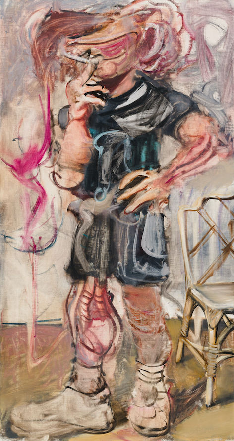 in Adrian Ghenies jüngstem Gemäldezyklus sind Zeitreisende: Die Zeit reist durch sie hindurch, beeinflusst ihre Konstitution, ihre Fähigkeit, Präsenz zu zeigen oder biografische Kontinuität zu erzählen. Die Arbeiten zeigen Quasi-Protagonisten – Figuren, die im Begriff sind, zu Grund zu werden, Grund, der den Platz der Figur einnimmt, indem er eine vage, krampfhaft anatomische Form annimmt. Torsi werden zu spiralförmigen Gebilden, Schädel werden zu barocken Gehäusen, Gliedmaßen verdrehen sich oder zucken, Augäpfel funktionieren wie Scharniere in den Rotationen einer abstrakten, panoramischen Optik. Das Universum ist in Bewegung und scheint sich um ihre Körperteile und Sinnesorgane zu drehen. Die Vitalität der Gesten und die Verdrehung der Körperhaltungen in den Gemälden ist kein Anlass, Bewegung als Ausdehnung oder Zweck, als Fragment eines Schicksals zu komponieren. Anstatt von einem inneren Bedürfnis angetrieben zu werden, scheint sie katastrophal oder zumindest widerwillig von außen zu kommen – als eine Kraft, die diesen spröden, von ihren Umständen marionettierten Körpern äußerlich ist. Ihre Erscheinung wird mühsam zersetzt, als wirbelnde Masse von Ausdehnungen und Kontraktionen wiedergegeben. Sie haben die Stigmata – ohne Quelle, Ekstase oder Wiedergutmachung – von Flecken und Unschärfen erhalten, Wunden, durch die sie Auflösung ausbluten, und mühen sich an den Grenzen der Wahrnehmungsunterscheidung ab, zwischen einem Verschwinden, das nie erreicht wird, und einer Kohärenz, die ihre erschöpfte Vitalität nicht garantieren kann. In dieser verkümmerten Zeit endet nichts jemals und nichts beginnt wirklich.