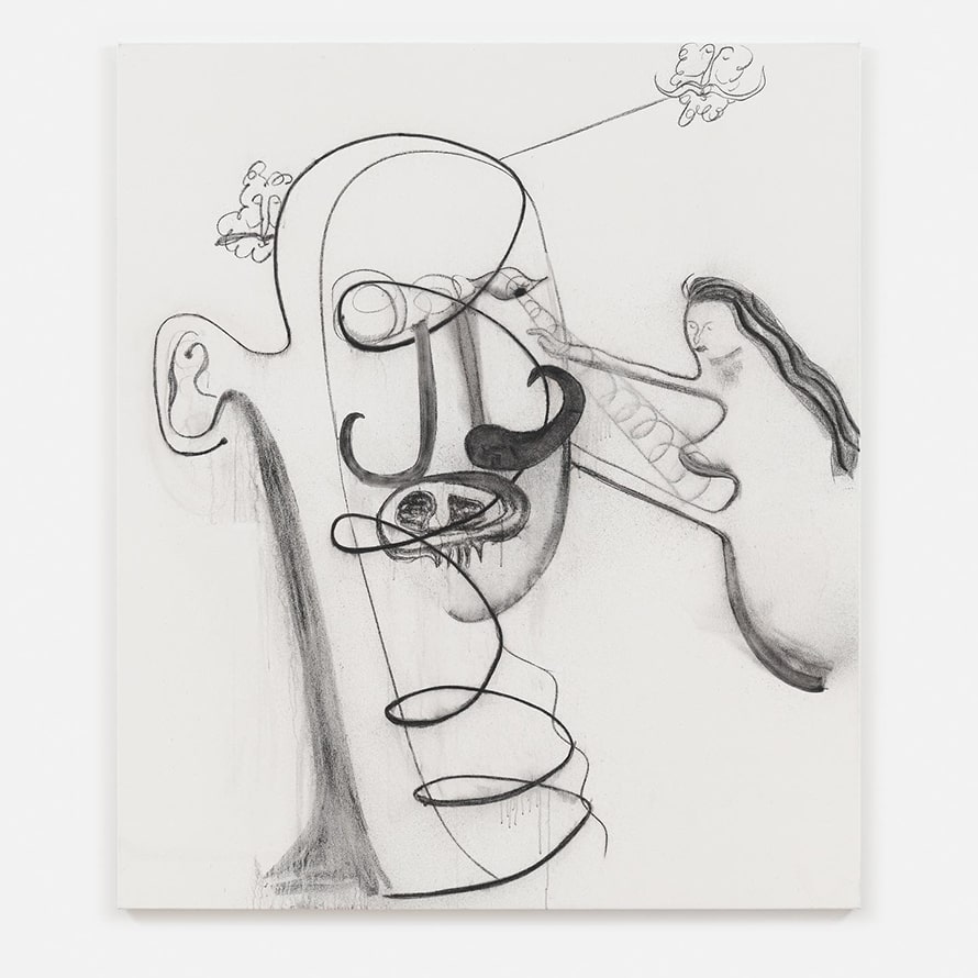 Albert Oehlens Bewunderung für den in Kiew geborenen amerikanischen Künstler John Graham reicht bis in die 1990er Jahre zurück. Die beiden großformatigen Werke, die in dieser Ausstellung zu sehen sind, entstanden fast vier Jahrzehnte später, im Jahr 2019, und sind mit Kohle auf Leinwand in verschiedenen Grautönen gemalt. Die Kompositionen, die eine zeichentrickartige Figur vor einem großen weißen Hintergrund zeigen, interpretieren und transformieren Grahams Gemälde Tramonto Spaventoso (Schrecklicher Sonnenuntergang), 1940–1949.
