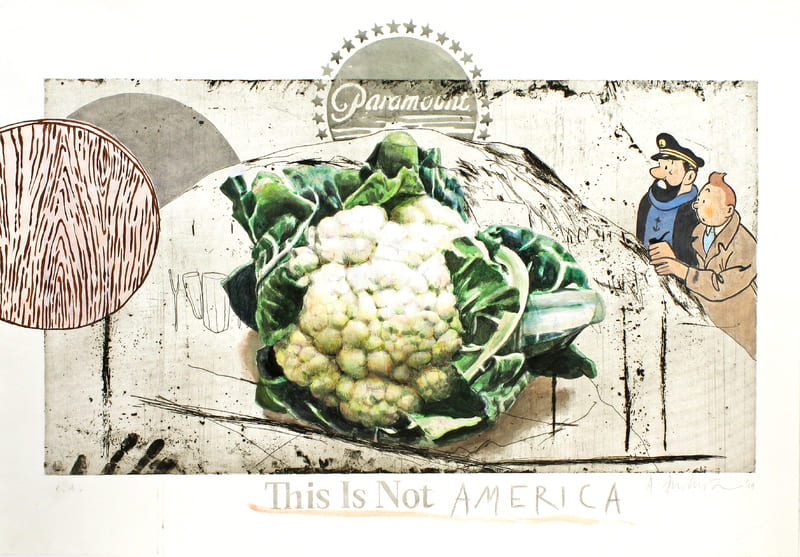 Bildunterschrift Titel: ANDREAS AMRHEIN, This is not America, 2019, Acryl und Farbstift auf Radierung, 70 x 100 cm