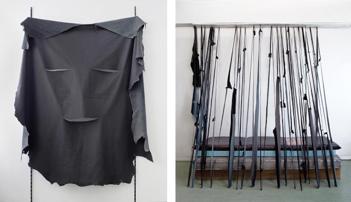 Bildunterschrift: Abbildung; Berlin (links), 2017, überarbeitetes Leder und Metall, 248 x 140 x 15 cm / Raum 1022, 2017, Leder, Gästebettmatratzen, schwarze Tusche, Holz, Kupferplatte, 230 x 210 x 100 cm