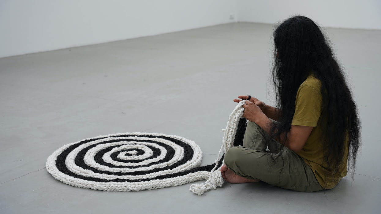 Die Arbeiten der jüngsten Werkschau von Antonio Paucar, entstanden während seiner Aufenthalte auf verschiedenen Kontinenten. Die Werke schlagen Brücken, zwischen unterschiedlichen Geografien und kulturellen Traditionen: den des Westens, der Anden und des peruanischen Amazonasgebietes. Dabei verbindet sich Vergangenheit und Zukunft miteinander. Seine Arbeit behandelt aktuelle Konflikte wie der Ermordung indigener Führer und Umweltschützer, dem Klimawandel und Überwachungstechnologien sowie gegenwärtige Kriege und totalitäre Regime. Einige seiner Werke zeugen von seiner Auseinandersetzung mit der traditionellen/historischen andinen Textilkunst und ihrer Materialität in Bezug auf den Körper und der Textilherstellung. In der Galerie weben Paucars Hände eine Spirale aus weißen und schwarzen Alpakafasern, eine Anspielung auf das Prinzip der dualen Reziprozität in der andinen Weltanschauung. Die Spirale symbolisiert das andine Denken – umfassend, kollektiv, Reflexion und Aktion verbindend, Vergangenheit und Gegenwart als Zyklus – im Gegensatz zum linearen westlichen Konzept mit seiner unidirektionalen Vorstellung von Zeit. Alle Handlungen werden als meditative Praxis angeboten, die Energie erzeugt und in Verbindung mit dem All, mit der Natur, mit Pacha Mama (Mutter Erde) steht.