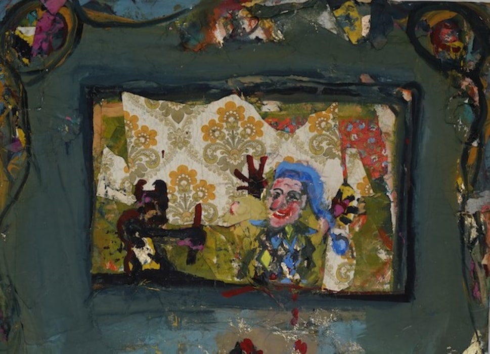 Bildunterschrift Titelbild: Caro Stark, Kaspertheater 1 – Kasper unbesiegbar, Papier, Acryl auf Textil, H 190 x B 130 cm, 2021