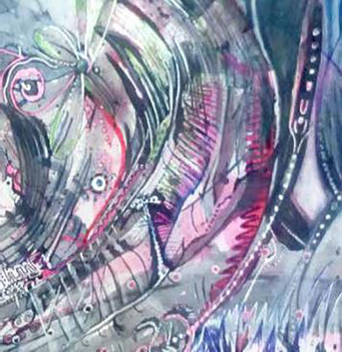 Melanie Edwards (geb. 1982 in St. Antonio, Texas, USA) arbeitet mit einer Vielzahl von Materialien, neben Buntstift, Filzstift, Kugelschreibern, Tinte und Textmarkern auch mit Blattmetallen und Collagentechnik. Auf Bildern, die Titel wie „Sanfte Spiralen in Grau“ oder „Aurorafenster“ tragen, entstehen turbulente und verwunschen Innenwelten. Die Künstlerin arbeitet im Tageszentrum „Leolo“ der prenzlkomm gGmbH.
