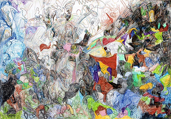 Peter Pankow (*1968) arbeitet in der Thikwa Werkstatt für Theater und Kunst. Sein barocker malerischer Gestus hat auf den ersten Blick, dank Farbe und Format, eine wuchtige und imposante Wirkung. Beim näheren Hinsehen erschließen sich vielschichtige Beziehungen aus Figurativem und zartgeschichteter farblicher Erzählung. Seine Blätter sind seine gedanklichen Ablagerungen, die er mit Nadeln durchpflügt und wieder freilegt. Es sind präzise Notizen bzw. Protokolle über sich, als Überich, Unterich, Altich und Neuich. Worte und Beschreibungen seiner Suchen, die Pankow auch auf der Bühne verwendet, wenn er Auskunft über sich gibt. Der Künstler wurde vielfach ausgestellt, mit dem Lothar-Späth-Förderpreis und dem Europäischen Kunstpreis/EUCREA Preis ausgezeichnet sowie 2014 für den euward 7 nominiert.