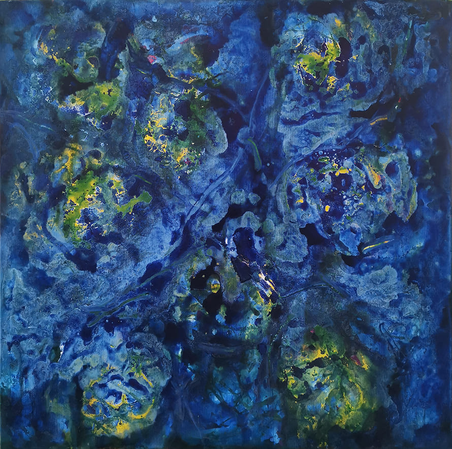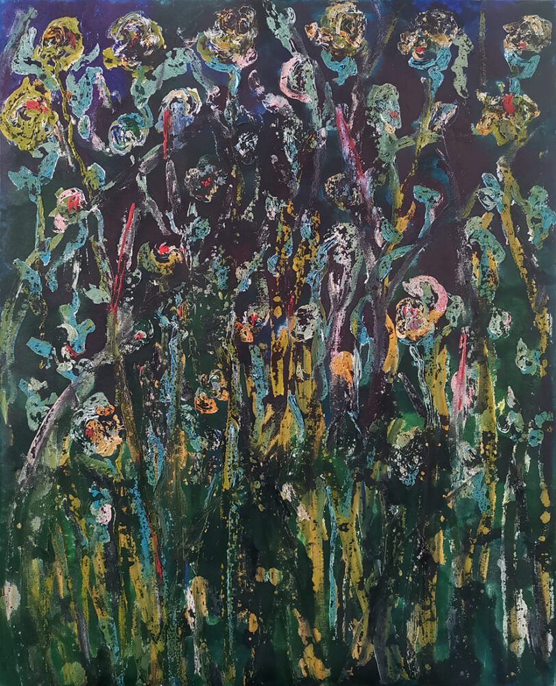 Seit 2025 taucht das Blumenmotiv erneut auf. Im Unterschied zu 2005 finden wir dunkle Farbenund komplexe, teilweise wie geologische Formationen wirkende Oberflächenstrukturen. Ein energetischer, intuitiver Gestus prägt sich aus, der im Werk der Malerin generell vermehrt in den Vordergrund tritt. Aus der Balance von Geschwindigkeit / Spontaneität, mehrfachen Überarbeitungsprozessen und dem Experiment mit verschiedensten Malmitteln schafft sie brillante, nahezu organisch gewachsene Strukturen.
