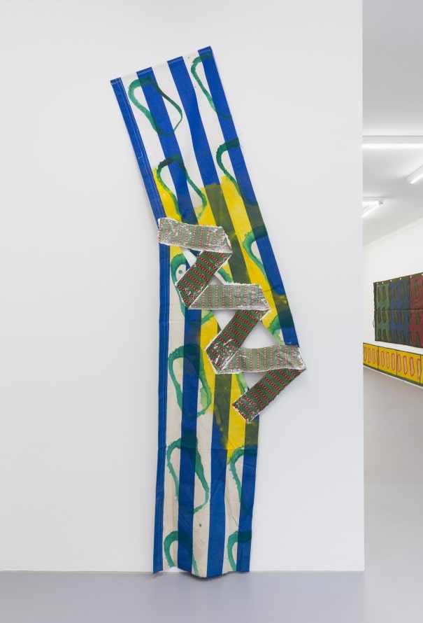 Rechts: Claude Viallat | 2020 / 369 | 2020 | Acryl auf Plane und zusammengefügten Stoffen | 272 x 86 cm