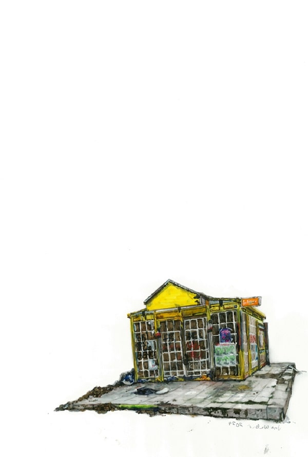 Bildunterschrift: Ina Weber, Imbissruine Berlin, 2024, watercolour, crayon on pergamin, 36 x 26 cm