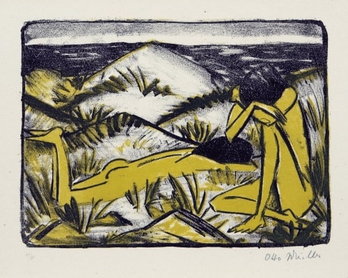 Otto Mueller | Ein in Dünen sitzendes und ein liegendes Mädchen | 1920/24 | Farblithografie