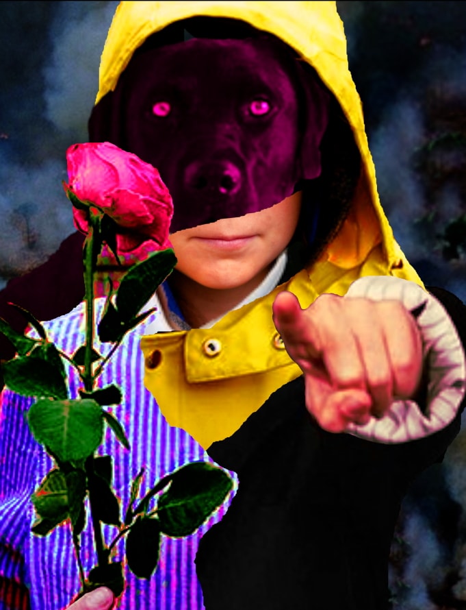 Die Collagen von Kathrin Günter haben sich inhaltlich diverser prominenter Akteure des Umweltschutzes angenommen. Für die „Porträts“ von Personen wie Leonardo Di Caprio, Greta Thunberg oder Jason Momoa hat sich Günter an digitalen Versatzstücken aus deren Instagram Accounts bedient und diese zusammen mit den Bildelementen von Tieren zu einem neuen Gefüge verknüpft. Das Ergebnis sind hybride Avatare aus Mensch und Tier, mit Symbolen und Gestik ihres ökologischen Engagements ausgestattet und vor dem bedrohlichen Hintergrund von Naturgewalten positioniert. Die dargestellten Persönlichkeiten offenbaren hier ambivalent bis ironisch ihre Stärken und Schwächen.