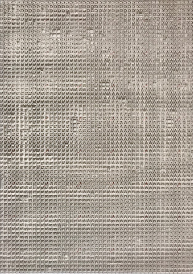 Eine der ausgestellten Werkgruppen besteht aus kompakten Plexiglaskästen im klassischen Din A4- und A3-Format. Diese Objekte beinhalten mehrere, hintereinander gestaffelte und durch Glasscheiben voneinander getrennte Papierschnitte. Als Grundlage für diese Papercuts dienen ihr unterschiedlich farbige Millimeterpapiere, Buchhaltungsseiten oder gerasterte Formulare. Mit einem Skalpell schneidet die Künstlerin die Zwischenräume heraus, so dass feine Gitternetze entstehen, die aber durch den Prozess des Schneidens auch immer wieder verletzt und mit kaum sichtbaren „Fehlern“ durchsetzt sind. Durch die Schichtung mehrerer Papierschnitte bilden sich räumliche Gefüge mit offenen Stellen, die die Möglichkeit eröffnen, auf die darunterliegenden Ebenen zu schauen. Der Rhythmus der Raster und die durchbrochene Regelmäßigkeit erinnern an engmaschige Gewebe, architektonische Fassaden, oder lassen Assoziationen an Systeme und Zellen zu.