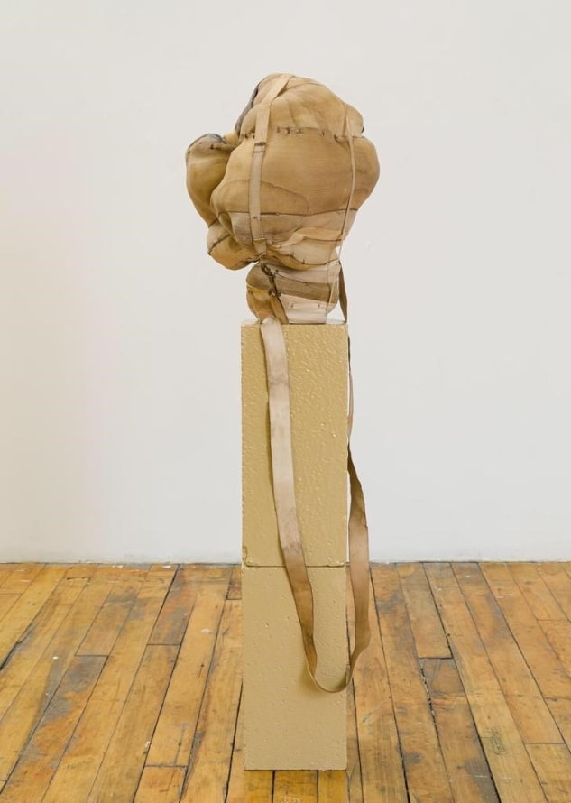Assoziative Offenheit kennzeichnet auch das Werk von Patricia Ayres. Ihre amorph geformten, humanoiden Skulpturen sind Schwestern der Venus von Willendorf und damit einer prähistorischen Formulierung von Weiblichkeit, gleichzeitig aber auch Verwandte der fetischartigen Puppen von Hans Bellmer. Eine Außenhaut aus farbigen Gummibändern, Stoff und Garn, zusammengehalten von Haken, Ösen und Karabinern, spannt sich über eine Konstruktion aus Watte, Moosgummi und Sperrholz. Die kleinformatigen Werke unserer Ausstellung könnten ebenso gut Torsi darstellen wie Köpfe. Assoziationen an die hautfarbene Unterwäsche längst vergangener Zeiten stellen sich ein. Man könnte an Miederwaren denken, die den weiblichen Körper nach meist männlichen Idealen zurichten, aber auch an Zwangsjacken, die den Bewegungsdrang psychisch Kranker durch Fixierung verhindern. Die Verletzlichkeit der Figuren spiegelt sich in den Sockeln aus übereinandergestapelten, teils farbig bemalten Schlackenbetonblöcken. Gleichwohl ist die unbändige Kraft der Skulpturen von Patricia Ayres überdeutlich, ihr unstillbarer Drang auszubrechen und, im Wortsinne, die Fesseln zu zerreißen und damit nicht nur den Körper sondern auch den Geist zu befreien.
