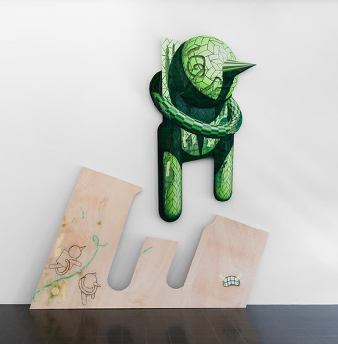 Dominik Halmer (geb. 1978 in München; lebt und arbeitet in Berlin) setzt sich in seiner Malerei mit sehr zentralen und grundlegenden Fragen der Bildsprache auseinander. „Worauf bezieht sich ein Bild? Wann nehmen wir etwas als Einheit war? Wie entstehen Narration und Bedeutung? Wie werden Stärke, Authentizität, Lebendigkeit oder Objektivität, Wert und Unwert, Freiheit oder Unfreiheit konstruiert? Dabei hat er seinen Bildraum in den letzten Jahren kontinuierlich ausgeweitet: vom Rahmenbild zum Bildobjekt, und schließlich vom Bildobjekt hin zu einer den Umraum annektierenden und integrierenden Bildform. (…) Dabei spielt er mit dem Wechsel zwischen objektivierender Distanziertheit und persönlicher, privat-mythologischer Aufladung. Werktitel und Referenzen an die Kunstgeschichte lassen dabei oft den subtilen Humor in den Arbeiten aufschimmern. Die große zweiteiligen Arbeit „Chloris“ (2020), die zuletzt in der Hamburger Kunsthalle gezeigt wurde, verweist auf den Moment der Bildentstehung im Atelier. Die geformte Leinwand, die sich von der am Boden stehenden Holzplatte herauszulösen scheint, suggeriert einen initialen Bewegungsimpuls. Das Bild verselbständigt sich in seiner Präsenz und tritt uns als Wesen gegenüber. Flüchtige malerische Gesten auf dem Holz, sowie Spuren der Werktätigkeit wie Eingravierungen, Farbtests oder (gemalte) Klebestreifen, weisen auf eine Prozesshaftigkeit hin, die auch in den Papierarbeiten sichtbar wird. (…) (So lässt) Dominik Halmer 8…) die Dinge in unterschiedlichen Seinszuständen erscheinen (…)“ (Artist Stamment, D.H.)