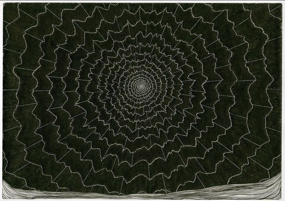 Paule Hammer (geb. 1974; lebt und arbeitet in Leipzig) präsentiert seine 50-teilige Serie von „Internetzeichnungen“ in einem 360°-Panorama. In schwarzer Tusche auf Papier und immer in demselben Format reihen sich die Impressionen des Künstlers ausgehend vom Begriff des WORLD WIDE WEB in allerlei bildhaften Mustern. So sind sie bspw. wiedergegeben in radialen Strahlen, in durch Störungen gewellte Linien oder als sich mehrfach kreuzende verlinkende Kurzstrecken. Es gibt aber auch biologisch anmutende Bildmotive wie die feinädrigen Verästelungen von Linien, die durch Knotenpunkte wie Synapsen miteinander verbunden sind und an Nerven- oder kapillare Blutbahnen erinnern. Bis hin zu psychedelischen Mustern, Horizonten mit kosmischen Strahlen, Strömen von Daten, welche in Wellen assoziiert sind u.v.a.m.. Es ist das totale Wuchern und Ranken auf dem sich lückenlos aneinander reihenden Bilderpanorama. Mit seiner soghaften Animation zu einer individuellen Vision und Aktion im Auge eines jeden Betrachters schafft der Künstler dialogische Kunstwerke zwischen dem Ich und seiner Umwelt.