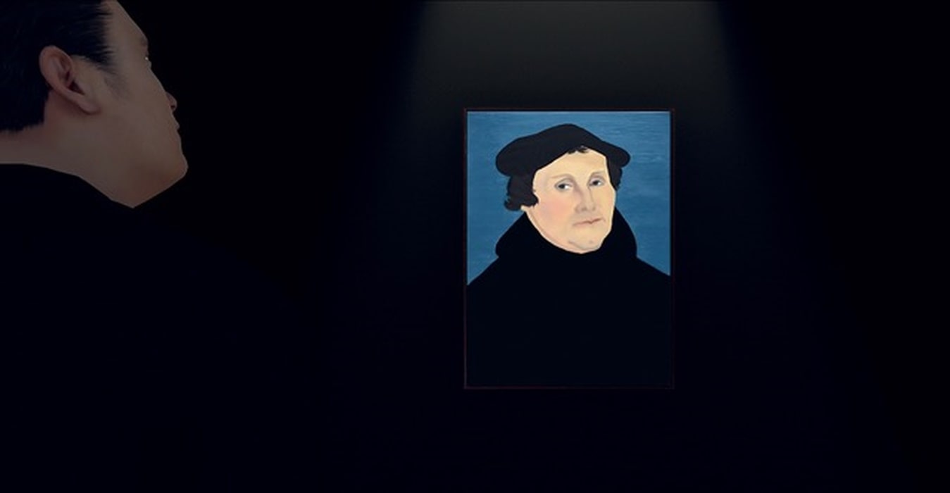 In der Galerie wird Androvas Animationsfilm FROM MY DESERT (2019, 14 min) gezeigt. Der Film begleitet „einen jungen Investor in den Genfer Freihafen zu einem Treffen, das sein Kunsthändler arrangiert hat, (…). Durch labyrinthische Gänge im Stil von Computerspielen bewegt sich die computergenerierte Figur durch das streng gesicherte Lagerhaus, (…) zu einem privaten, klimatisierten Ausstellungsraum. Dort trifft der Investor auf das berühmte Porträt Martin Luthers (1528) von Lucas Cranach dem Älteren. (…) Zwischen dem Investor und dem Reformer entwickelt sich eine Freundschaft, sie reden über „typischen Männerkram“ – wie man politische Macht und Loyalität nutzt, um voranzukommen, … (…).