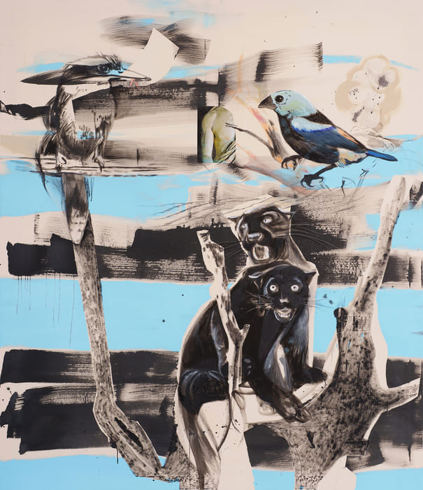 Im aktuellen Zyklus Morpheus begegnen sich Raubtiere, Vögel und Spuren des Kleinstlebens – nicht in Konfrontation, sondern in einer paradoxen, friedlichen Koexistenz. Was in der Natur als Spannungsverhältnis gilt, wird im Bild zu einem fragilen Gleichgewicht. Die Malerei wird zur Bühne simultaner Zustände: Gefahr und Schönheit, Präsenz und Entrückung, Wachen und Träumen.