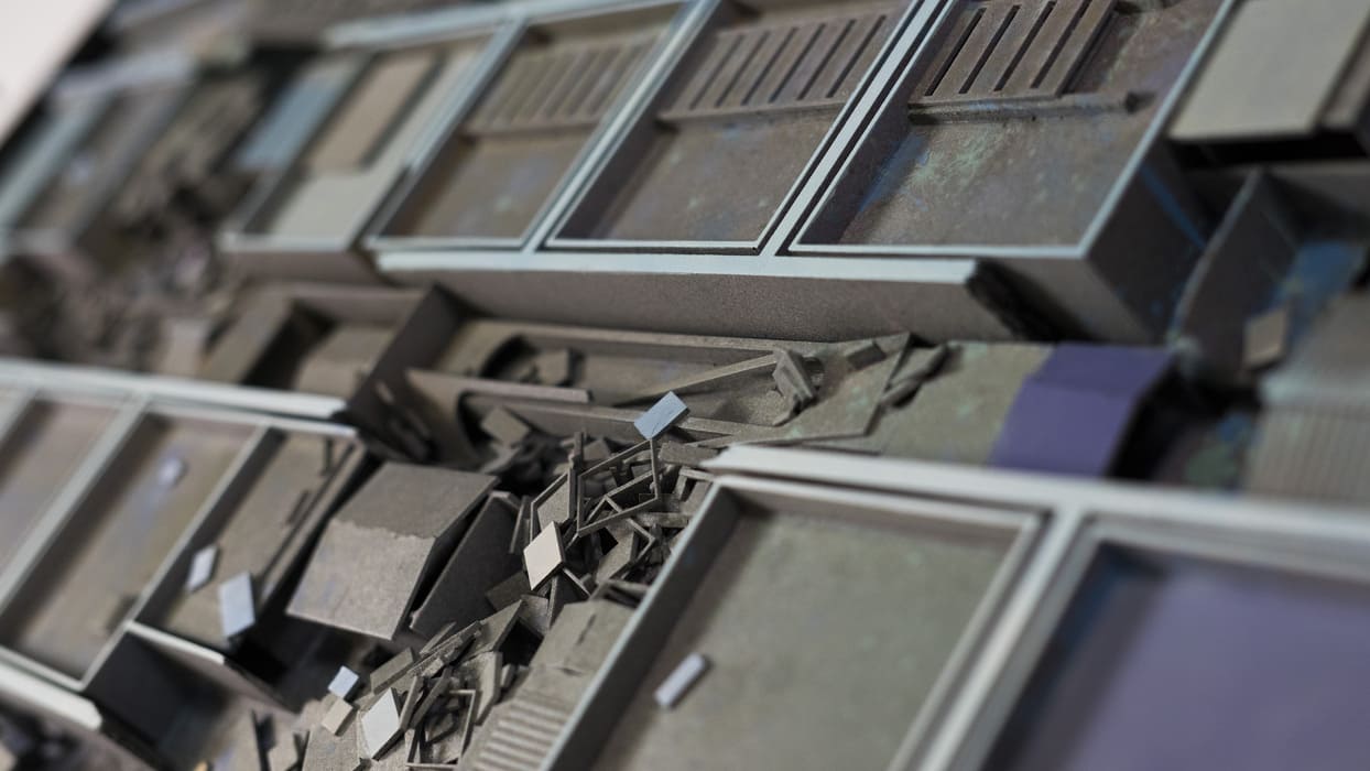 Hendrik Czakainski, Non Point sources #7 (Detail), 2025, MDF, Karton, Spachtel, Farbe, 145 × 145 cm.