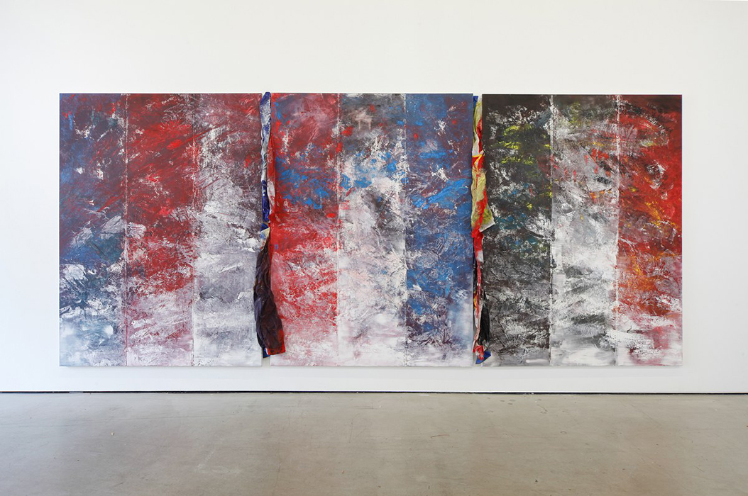 Bildunterschrift: Ivan Grubanov, The Return of the National, 2019, oil on embroidered canvas and vintage flags, triptych, 230 x 525cm