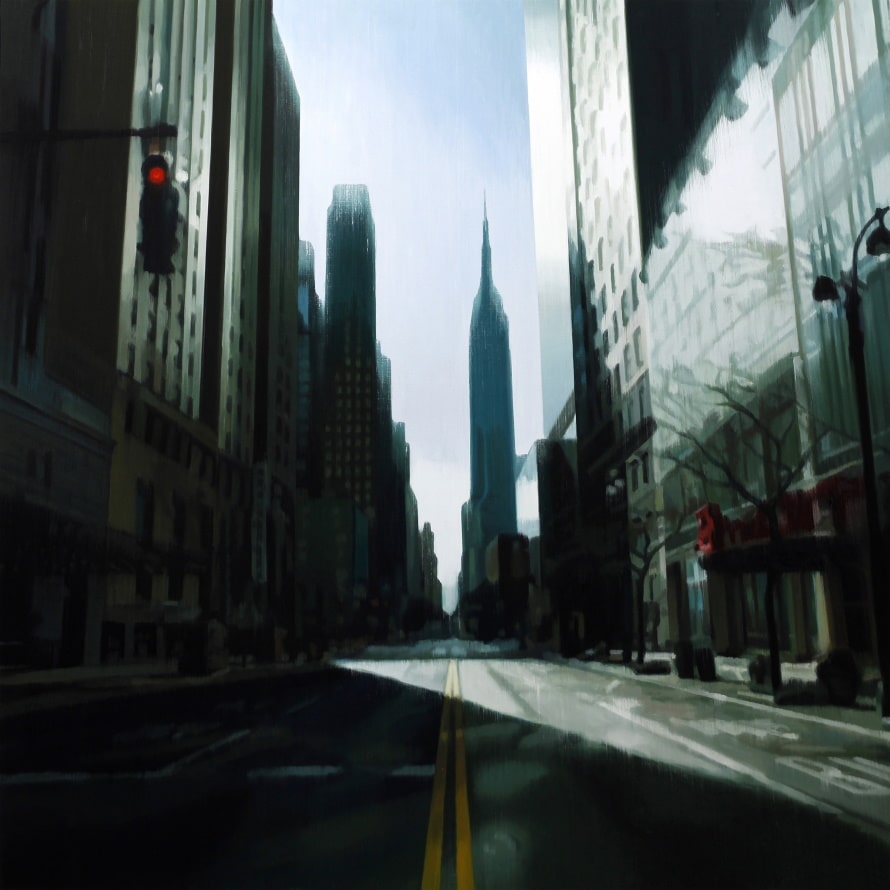 Zu seinem Repertoire gehören urbane Landschaften ebenso wie berühmte Bauwerke der internationalen Moderne, aber auch Darstellungen von Autos und Flugzeugen, von transitorischen Orten wie Tankstellen und Terminals, die immer wieder an filmische Bilder denken lassen, an Szenen wie aus einem Road Movie.