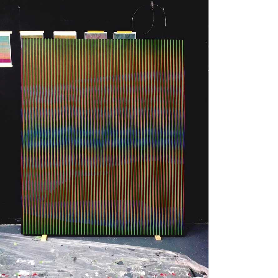 Im Zentrum von Jörres’ Kunst steht der raumzeitliche Charakter unserer Wahrnehmungen. Die Arbeiten werden in linearen Schichten angelegt und von Hand in Acrylfarben ausgeführt. Dabei werden mehrfach Bereiche abgeklebt und wieder freigelegt, sodass in einer Vielzahl von Anordnungen und Arbeitsschritten eine flächige und doch auf subtile Weise räumliche Oberfläche entsteht. Die Spannungen, die in die Komposition eingelassen sind, rufen falsche Schatten oder Formen hervor, die sich unter den Augen des Betrachters zu bewegen scheinen. Flirrende Landschaften scheinen zu entstehen. Aus diesem lebhaften Energiefluss heraus durchbricht das Werk die Flächigkeit seiner minimalistischen Form und drängt zurück in eine Dreidimensionalität, die sich nun auf den Vorder- und Rückseiten der modularen Gestelle entfaltet. Diese könnte man nach links oder rechts rollen, könnte sie drehen um ihre eigene Achse; ein beinahe performativer, aber als Funktionalität und rationale Gestik getarnter Auftritt.