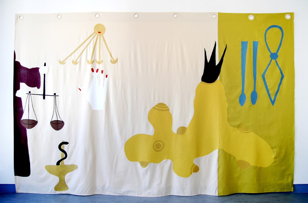 Charles’ Vorhänge aus der Serie „Pharmakon“ erzählen eine spekulative Geschichte der Medizin aus dezidiert weiblicher Perspektive. Bilder und Symbole in Knallfarben sind in unbestimmter Anordnung auf den Stoffbahnen verteilt, anstatt eine chronologisch oder serielle Reihenfolge zu ergeben. Sie verweisen auf und verbinden persönliche, mythologische wie auch historische Erzählungen von weiblicher Gesundheit und Heilung: Der Zyklus des Mondes ist eng mit dem weiblichen Menstruationszyklus verbunden; die Schlange ist ein jahrhundertealtes Symbol für Fruchtbarkeit, schlängelt sie sich um eine Schüssel, wird sie zum international Zeichen für Pharmazie; das Bild von großen violetten Händen mit rot lackierten Nägeln, die ein Gelenk umrahmen, erinnert an die heilende Kraft des Handauflegens; Ingwer, Löffel, Waagen und Kräuter können als generelle Verweise auf Pflanzenheilkunde gelesen werden, beziehen sich aber auch ganz konkret auf die ausgiebige theoretische und literarische Recherche der Künstlerin zur Geschichte der Hexerei, Heilkunde, (weiblichen) Gesundheit und Krankheit.