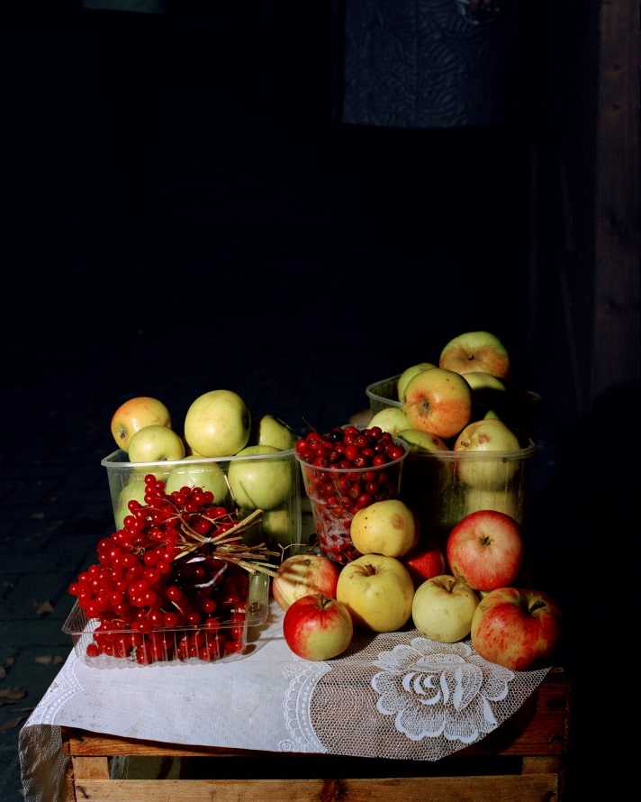 Nach dem wichtigsten Einfluss auf ihre Arbeit gefragt, antwortet Lia Darjes: „Besuche in der Berliner Gemäldegalerie.“ Dieser Einfluss wird in ihrem neuen Buch „Tempora Morte“ deutlich sichtbar. Die fotografische Serie entstand 2016 in Kaliningrad in Russland und dokumentiert die bescheidenen Marktstände, an denen alte Frauen zur Aufbesserung der Rente am Straßenrand anbieten, was der eigene Garten oder der benachbarte Wald an Ernte hergaben. „Im Herbst findet man da etwa drei Äpfel, ein paar Rosinen und zwei Bund Knoblauch. Zu anderen Jahreszeiten vielleicht zwei Gläser hausgemachte Erdbeermarmelade und zwei Kohlköpfe oder getrockneten Fisch.“