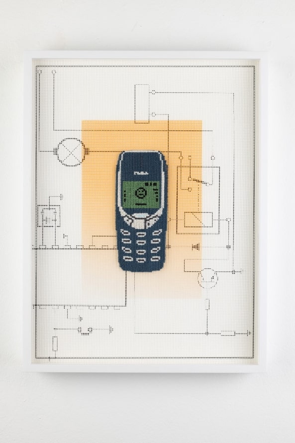 „Nokia 3310 cellphone (2000)“ from the series Early Digital Tech, Agents From The Age of Acceleration, 2021, inkjet print, print on strammen fabric, handmade embroidery, cotton threat, 40 x 21 cm, Foto: Thomas Bruns, Berlin