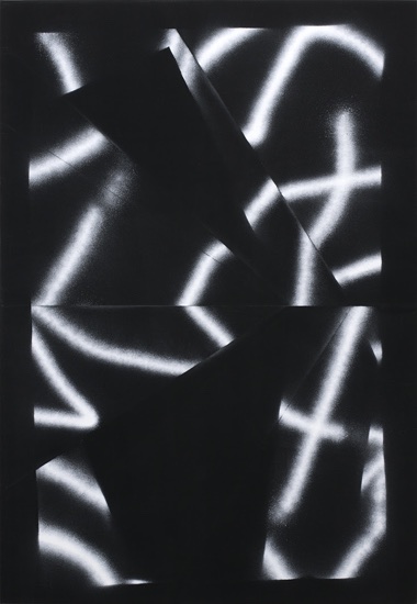 Unter dem Titel „Lorem Ipsum“ zeigt Marcel Frey in seiner vierten Einzelausstellung in der Galerie eine Serie neuer Malereien, für die er Leinwände gefaltet und mit Sprühlack bearbeitet hat. Durch die Faltungen entstehen geometrische Formen und Flächen, die, unterbrochen von zerstückelten Linien und Kurven, wie Fragmente eines größeren Ganzen auftreten. Während das Auge versucht, die einzelnen Bildelemente durch imaginäres Drehen, Wenden und Umsortieren wieder zu einem stimmigen Puzzle zusammenzuführen, bleibt der Inhalt des Dargestellten – angelehnt an das Schema des Blindtextes „Lorem Ipsum“, der immer nur Form, nie aber konkreter Informationsträger ist – vorerst ungeklärt.