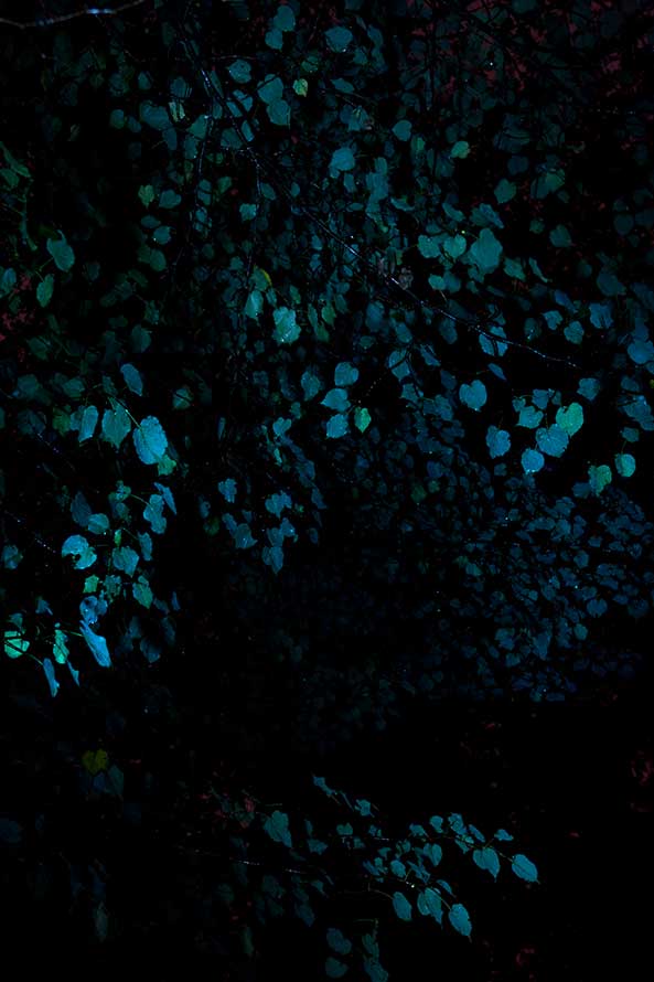 Während die Serie der Überstrahlungen kameralos im Labor entstehen, umfasst die Werkgruppe mit dem Titel Nachtgestalten Kameraaufnahmen. Angelehnt an die Dunkelheit im Fotolabor, begibt sich Maria Jauregui zum Fotografieren in die Nacht. In der freien Natur werden die Motive ausschließlich mit einer Taschenlampe angestrahlt. In den Aufnahmen dominiert die Dunkelheit, doch es werden Verästelungen sichtbar, man sieht das Grün, Braun oder Gelb der Natur, man erkennt Erdiges, Grasiges, bläuliche oder violette Lichtreflexe. Diese flüchtigen Wesen der Nacht sind kaum zu erfassen: Grashalme erinnern an Glühwürmchen oder tanzende Elfen, Blätter an erstarrte Fledermäuse oder Waldgeister. Die Bilder entwickeln ein geheimnisvolles Eigenleben – im Betrachter selbst.«
