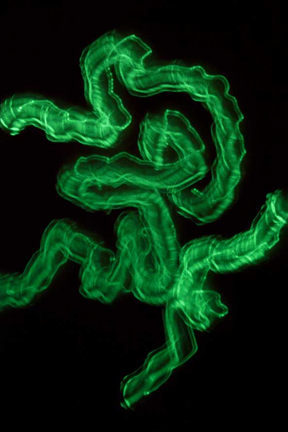 Die Ausstellung zeigt außerdem Arbeiten von Jauregui Ponte aus der in 2019 entstandene Serie Phosphor. In Altgriechisch bedeutet Phosphor „lichttragend“. Der Lichtträger ist in diesem Falle eine nachleuchtende, phosphoreszierende Folie, die mit Licht aus einer Taschenlampe angestrahlt wurde. »In einem dunklen Raum zeichne ich Lichtbilder auf der Folie mit dem Licht der Lampe, wie mit einem Stift auf Papier. Sobald die Lampe aus ist, strahlen diese Bilder nach und verschwinden allmählich innerhalb weniger Minuten. Die kurze Zeit, in der die Lichtzeichnungen sichtbar sind reicht um die Bilder mit der Kamera fotografisch festzuhalten bevor sie ganz weg sind und die Folie wieder bestrahlt werden kann.« (Maria Jauregui Ponte) Das Ergebnis dieses Experimentes sind faszinierende, amorphe Fabelwesen, die einem Sciencefiction Film der 1980er Jahr entsprungen zu sein scheinen.
