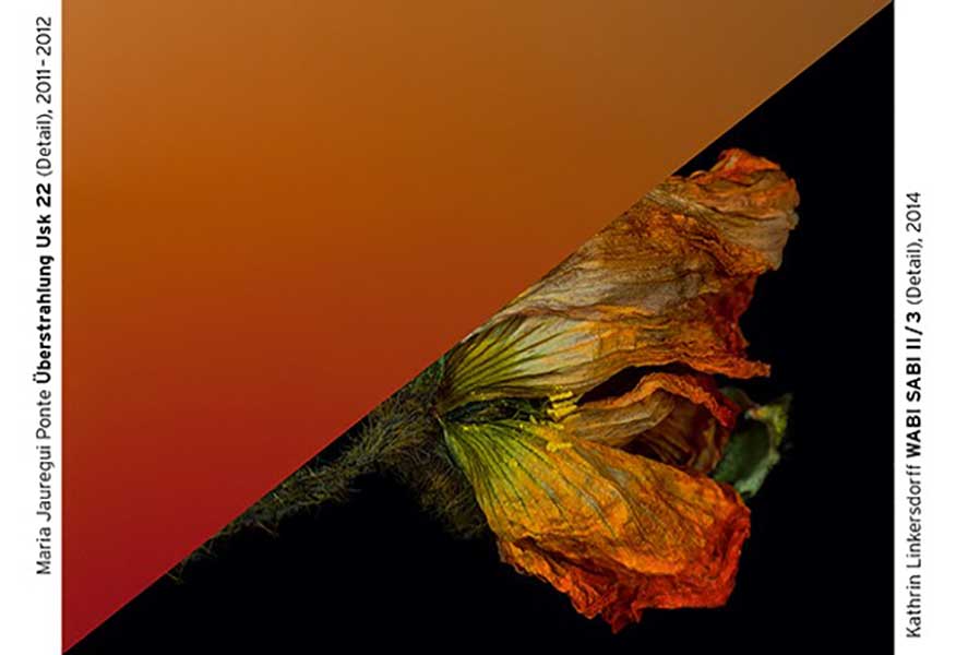 Der Begriff Wabi Sabi verweist auf ein ästhetisches Empfinden, das in Japan als kulturelle Tradition fest verwurzelt ist. Es ist kein sprachlich gefasstes künstlerisches Konzept, kein Manifest oder Erklärungsmodell und gibt auch als Titel keine Interpretation für die Fotografien wieder. Vielmehr legen die Darstellungen der welken Blumen den Begriff für uns aus. Es lohnt sich, sein Augenmerk gezielt auf das Wechselspiel von Glanz und Dunkelheit zu legen und nach dem Schattenspiel zu suchen, dass sich im wahrsten Sinne des Wortes zwischen Farben und Formen entfaltet. Der Zwischenraum ist realer Bedeutungsträger. Aus tiefer Dunkelheit leuchtet in der Farbigkeit ein Glanz auf, der den schon vergangenen Blumen eine Schönheit verleiht, die sie vielleicht auf der Höhe ihrer Blüte nie besessen haben.