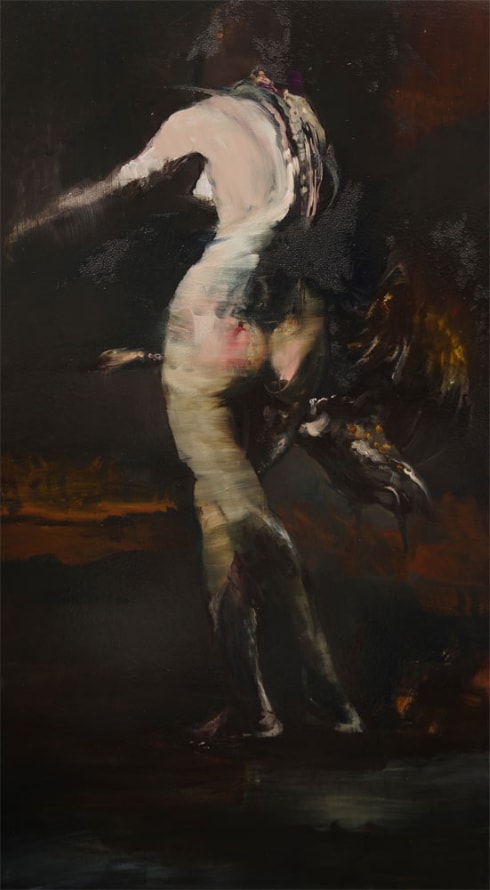 Maurizio LAltrella, Leda dopo l, amplesso si trasforma in cigno, oil on canvas, 130 x 70 cm, 2020