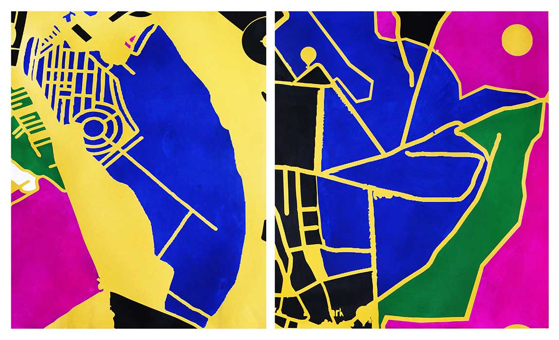 Während die eigene Praxis des Künstlers als ein Akt der „Rückeroberung“ der Kartografie betrachtet werden kann, bleibt die ursprüngliche Strukturierung der Karten erhalten. Auf diese Weise sind wir eingeladen, die Werke auf mehreren Ebenen als Kunstwerke sowie Abbildung menschlicher Behausung zu betrachten. Und doch bleiben wir von den Lebensrealitäten, die in den Siedlungen herrschen, distanziert. Vielleicht ermutigen uns die Kunstwerke dazu, über die Gefahr nachzudenken, die mitschwingen, wenn Gesellschaften und Menschen zu visuellen Symbolen gemacht werden.