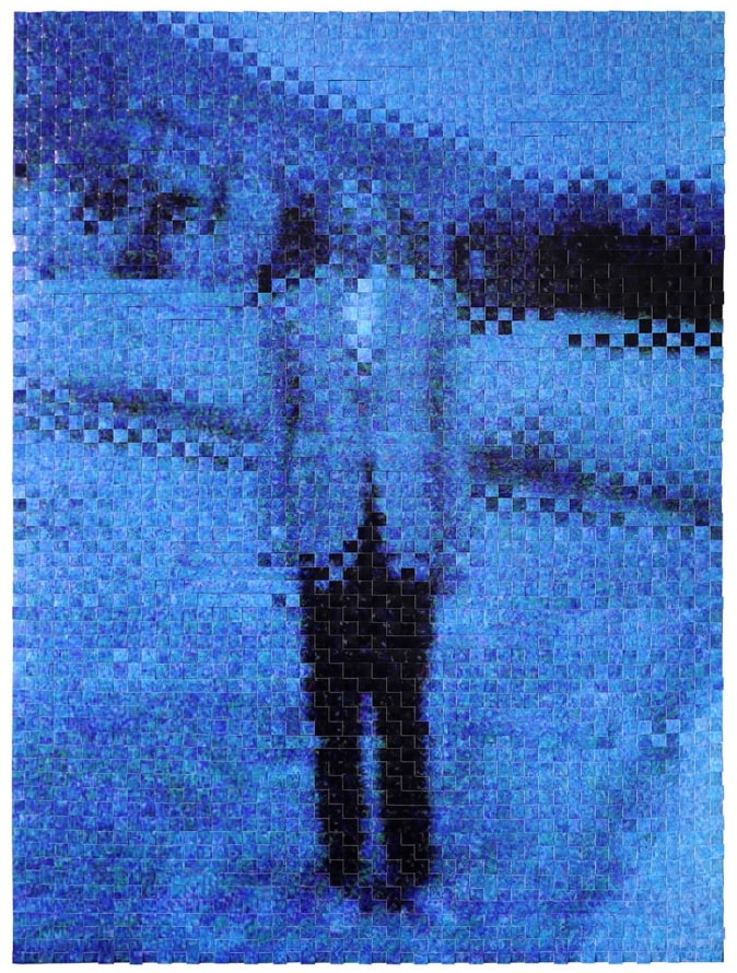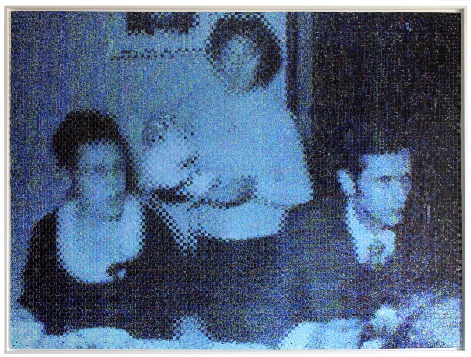 Als ersten Schritt photographiert Sebastian die gefunden Bilder mit einem Handy beim Licht der Abenddämmerung. Dadurch bekommt das entstehende Bild eine bläuliches, schimmerndes Störelement. Danach schneidet er das neue Bild in Streifen und webt es als neues, einzigartiges Objekt wieder zusammen. Die unscharfen gefundenen Objekte erzählen eine Geschichte ihrer Zeit und umgeben ihre melancholischen Figuren mit einer nebelartigen Atmosphäre, die andere Erfahrungskanäle erschließt als das direkte Sehen.
