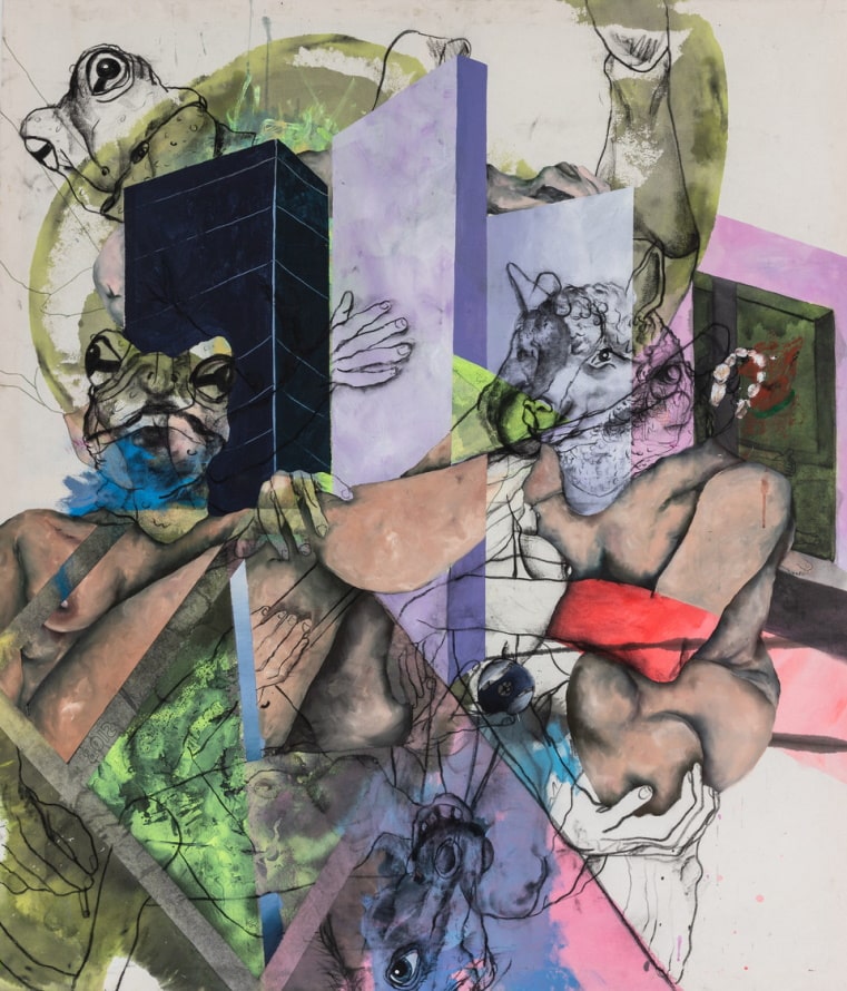 Nadja Lana nutzt eine dünne Schicht Acrylfarbe, sowie Kohle und Sprühfarbe um ihre Figuren zu kreieren, die einander überlagern und manchmal beinahe unsichtbar bleiben. Wir sehen als Betrachter private Szenen und werden zu Voyeuren von Orgien ekstatischer Körper ohne genau zu wissen, wo ein Körper endet und der nächste beginnt. Tiermasken – manchmal karikaturistisch, manchmal realistisch und präzise gestalten und verbergen die Gesichter und tragen zur sexuellen Spannung der Subjekte bei. Unser Auge wird zur Mitte der Bilder gezogen, wo es zur Sache geht. Hier drehen und winden sich Körper in gegenseitiger Überlagerung und Penetration, gelegentlich unterbrochen von Farbflächen oder architektonischen Elementen. An den Bildrändern finden sich große unbemalte Stellen, die die Leinwand frei geben, die zur Rohheit der Bilder beitragen und gleichzeitig von der intensiven Farbigkeit der zentralen Szene wegführen.