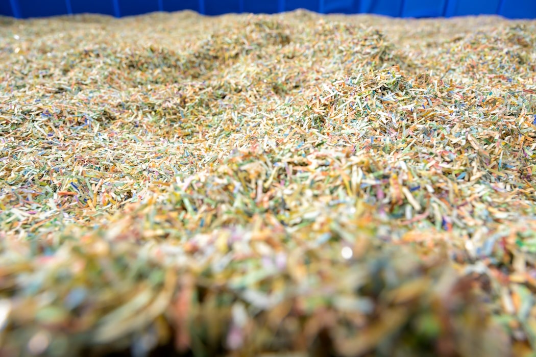 Bildunterschrift Titelbild: Janine Mackenroth, Detailansicht: „Money Pool“, 1 Millionen geschredderte Euro Geldscheine, 180 x 180 cm, 2023. Foto: René Löffler