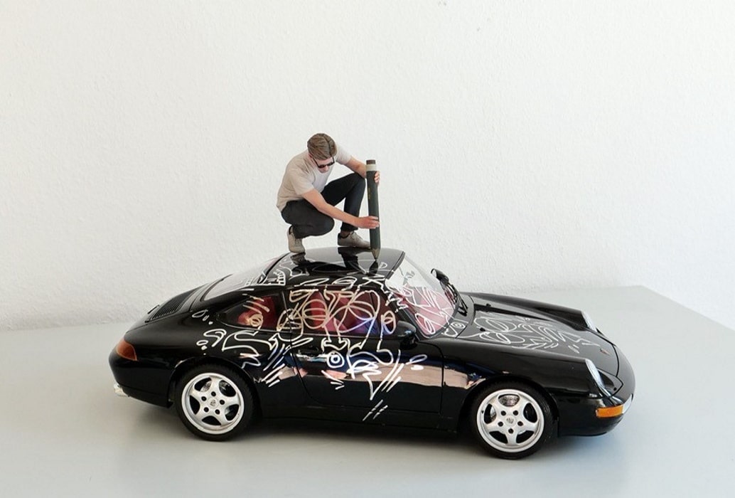 Bildunterschrift Titelbild: Peer Kriesel, Bereit – Me So Small Installation, Fratzen-Zeichnung auf Porsche-Modell (911) (1:8), Figur (Kunststoff), 29 x 54 x 25 cm, 2021