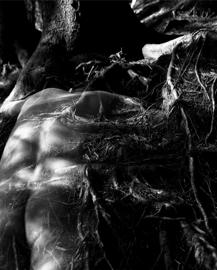 Für Per Christian Brown (1976, Stavanger, Norwegen, lebt und arbeitet in Berlin, Oslo und Stavanger) sind es die Wurzeln, die seine Arbeit antreiben. Um es mit seinen Worten zu sagen: „Die Wurzel ist ein Archetyp für etwas Festes und ein Lebensspender für alle Pflanzen. Sie hat eine Vitalität, die in die unendlichen Tiefen der Erde hinabreicht, tief in den Boden, wo die Toten ruhen: eine robuste Kraft des Lebens inmitten der Verwesung. So komponiert er sowohl mit Video als auch mit Fotografie, um in diese Wurzeln einzudringen, um ihre innere Natur zu entdecken (vgl. Gaston Bachelard). Dank der Doppelbelichtung der Negative verschränkt er seine Modelle mit den mächtigen Wurzeln der alten Bäume. Das Ergebnis ist eine Verwirrung zwischen Mensch und Natur, in einer schmerzhaften Harmonie wie eine moderne Ovidsche Metamorphose.