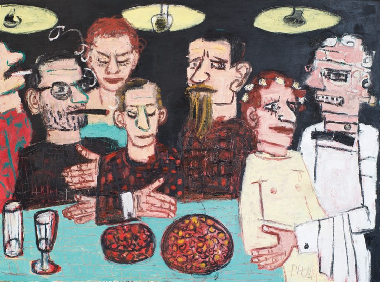 Bildunterschrift: Peter Herrmann, „Zu vier Händen mit Frankenstein und seiner Geliebten“, 90 x 120 cm, Öl auf Leinwand, 2014