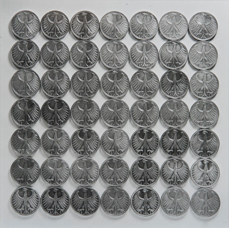 Ein Ordnungsgefüge, keine Komposition. Eine Fläche ist angefüllt mit gleichartigen Objekten, man kann sie nicht unterscheiden. Das Bild hat keinen Ereignisort, es ereignet sich überall.