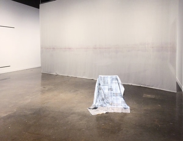 Ein geteilter Raum. Eine performative Geste des Entfesselns, oder Destabilisierens. Von Hand. Ein vergänglicher Fingerabdruck. Ein Tapisserie aus einem Material, das in Funkantennen, Heizelementen, elektromagnetischer Abschirmung und Schutzbekleidung verwendet wird. Ein kurzer Film über die schiere Unsichtbarkeit seines eigene Gegenstandes in einer aktuellen Studie über das Phänomen der dunklen Materie.
