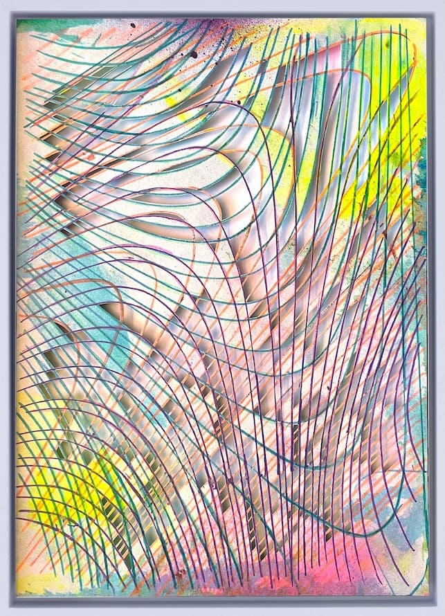 Neu sind Arbeiten, in denen Schlipkoeter ihre Auseinandersetzung mit Linie und Interferenz konsequent erweitert. In Objekten aus Papier und Harz wird die Linie nicht mehr allein als räumliche Struktur, sondern als zeitlich geschichteter Prozess erfahrbar. Transparenz, Schichtung und Materialität machen Verdichtung, Sedimentation und Dauer sichtbar. Sie erweitern den bisherigen Werkzusammen- hang um eine zeitliche Dimension. Formen, die an Bohrkerne oder Schnitte durch geologische Schichten erinnern, verbinden Material, Farbe und Zeit zu räumlichen Konstellationen. Farbe erscheint hier nicht als Oberfläche, sondern als Tiefen- phänomen: In Werken wie RGB und Phasenraum werden Farbwerte und Wellen- längen explizit aufeinander bezogen und als räumlich erfahrbare Relationen sichtbar. Interferenz wird nicht nur dargestellt, sondern materialisiert.