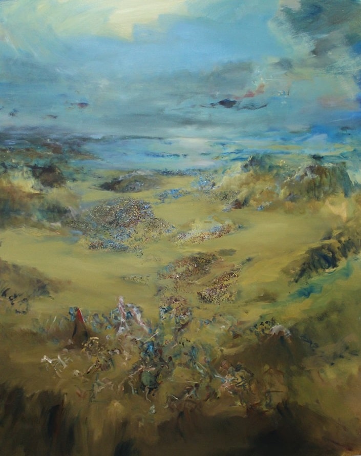 Jedes Gemälde von Oscar Contreras Rojas entfaltet allmählich einen Schwerpunkt, der die Szenerie belebt und an das magnetische Auf und Ab einer venezianischen Lagune erinnert, ein Echo der früheren Studien des Künstlers. Dabei verwandelt er die Materie, indem er jede Facette der Natur nach seinen eigenen Vorstellungen umgestaltet und Körper schafft, die vibrieren, wandern, sich niederlassen und schließlich im kollektiven Bewusstsein aufgehen. Ordnung und Rhythmus liegen seinen Werken zugrunde. Diese Elemente durchlaufen eine Metamorphose und passen sich je nach Blickwinkel des Betrachters ihrer Umgebung an.