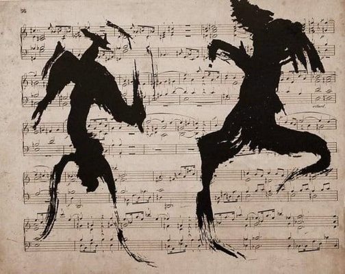 Bildunterschrift: Albrecht Genin, „Musik III“ , Radierung über Noten auf Büttenpapier, 1995, Blatt 50x60cm