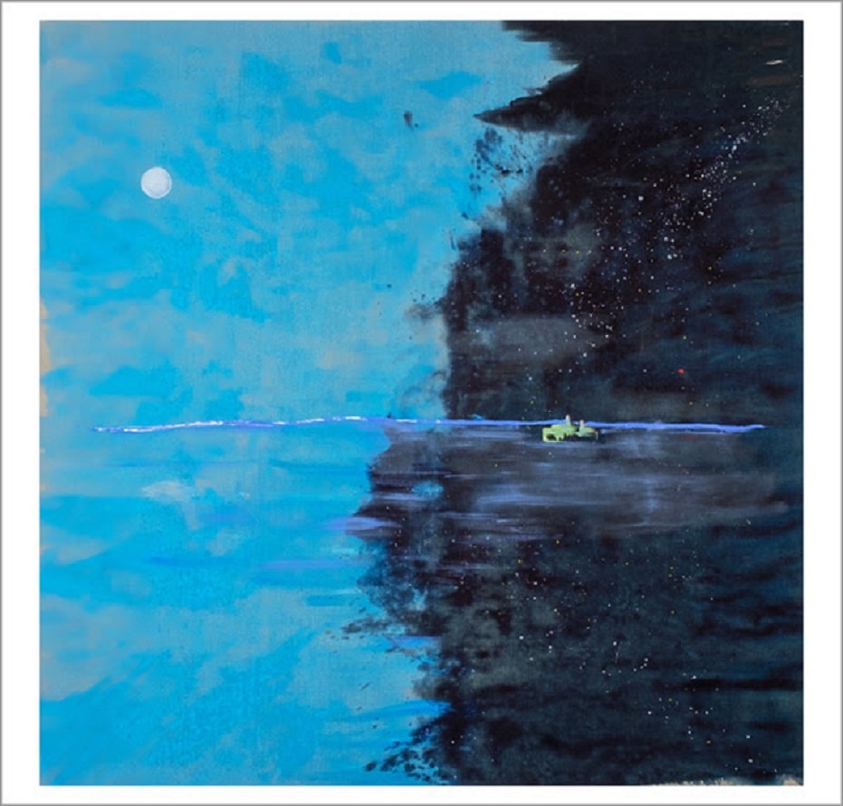 Das Bild ist doppelt zweigeteilt, links der Tag, rechts die Nacht, oben der Himmel, darunter das Wasser. Horizontlinie, Schiff und Vollmond genügen, um das Bild zu verorten. In Farbschleiern zeigt sich die Dämmerung, in Farbspritzern der Sternenhimmel. Wohin fährt das Schiff? In die Dunkelheit oder zum Licht? Wird es Tag oder bricht Nacht herein? Ankunft oder Abschied? Die Bilder von Tobias Wyrzykowski wirken entrückt und reduziert. Der Betrachter blickt aus der Ferne auf das Geschehen. Wiederkehrende Motive sind die vier Elemente Feuer, Wasser, Erde, Luft, dazu die Gestirne und Kometen, Küsten und Horizonte, Schnee und Eis, Berge und Wiesen. Spuren des Menschen gibt es wenige: mal ein Schiff, eine Brücke, eine Rakete, ein Haus. Tobias Wyrzykowski spricht von ungreifbaren Bildwelten, die nicht beliebig, sondern – Traumbildern gleich – mehrdeutig sind. Sie entstehen intuitiv, je nach Stimmung, teils gedankenverloren, teils zufällig oder tatsächlich nach Traumresten. Schon die Fahrt zum Atelier, den Düsseldorfer Rhein entlang, ist für ihn ein Rückzugsraum auf dem Weg zu einem vielleicht unerreichbaren Ziel, weit weg von allem – die Malerei als Sehnsuchtsort.