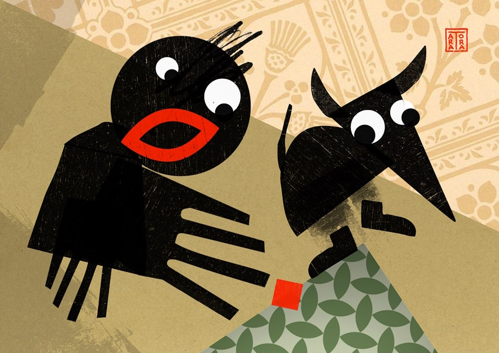 ARATORA, Gassi geh’n, 2023, Holztypendruck mit Tapetencollage, mit Hanko gesiegelt,