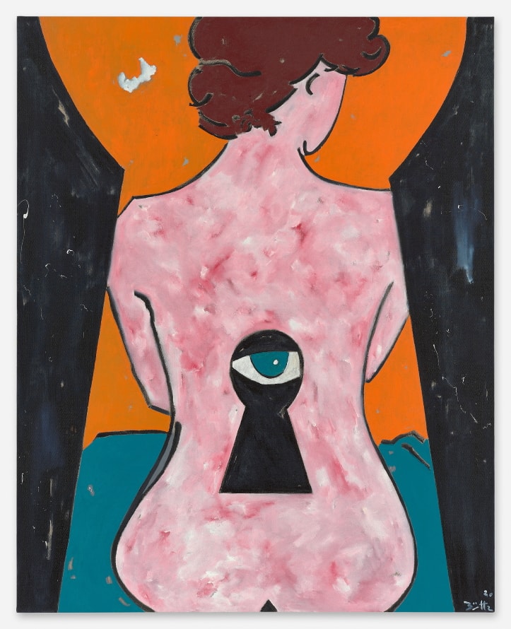 Undichte Schlüssellöcher zeichnet sich andererseits durch eine gelassene Art von Gewalt aus, nicht unähnlich der von Man Rays ikonischer Fotografie Ingres’ Violin (1924), die das durch die Hinzufügung von F-Löchern auf ihrem nackten Rücken in ein fleischliches Instrument verwandelte Model Kiki Montparnasse zeigt. Während Man Ray den weiblichen Körper als einen Gegenstand darstellt – eine Oberfläche, in die man hineinschneiden oder die man verzieren kann –, klingt Büttners Riff über dieses Klischee außerordentlich selbstreflektiert. Statt einfach nur zu objektivieren, ist diese Darstellung der weiblichen Form ebenso verletzt wie verletzend. Das Auge blickt zu uns, die hinsehen, zurück. Aber wessen Auge ist es? Widersteht der weibliche Körper irgendwie diesem Blick, wie ein Superheld aus einer anderen Welt mit dem Auge am falschen Platz? Oder, was wahrscheinlicher ist, handelt es sich um eine Umkehrung des voyeuristischen Blicks, sodass der Voyeur mit seiner eigenen Niedertracht und Verdorbenheit konfrontiert wird? Wie Hustvedt anmerkt, haben wir in der Kunst keinen Zugriff auf lebendige Körper, und wenn wir sie betrachten, betrachten wir fiktive Räume. Der in Büttners Bild dargestellte Körper kann eindeutig nie in der realen Welt existieren, aber er spricht Bände über Büttners Weltsicht. Zur ironischen Distanz, einer Stimmung, die sich durch seine Bilder zieht, gehört, „sich von außen zu sehen“, und in diesem Fall blickt das Bild zurück.